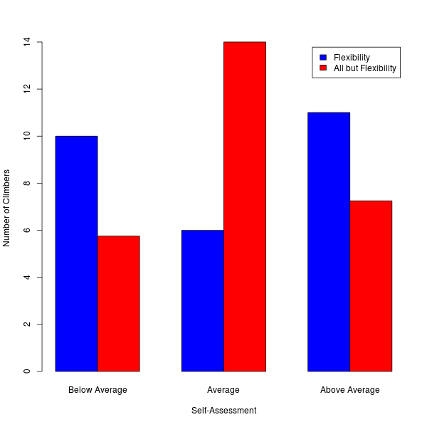 Amusingly, most everyone has a strong opinion of how flexible they are: Of the 27 people who answered the questions in the abilities section, only 6 said they had "Average" flexibility, compared to a mean of 14 climbers who said they were "Average" in each of the other eight skills.