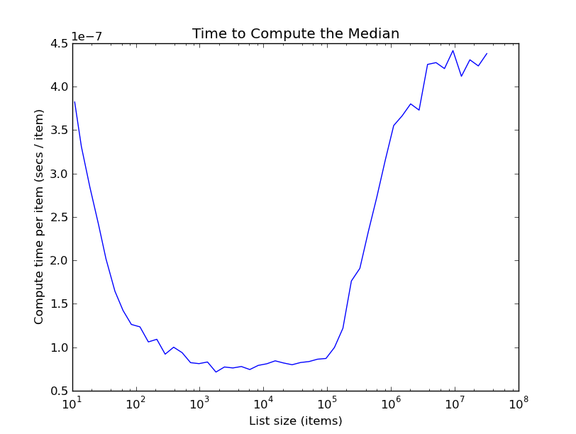 The first part of the plot is understandable: the time per item drops quickly with list size as startup costs get amortized over more data. But the truly bizarre thing is that after lists get bigger than about 100K, the time per item starts to increase massively! What's going on? In the rest of this post I describe the things I tried to find out: